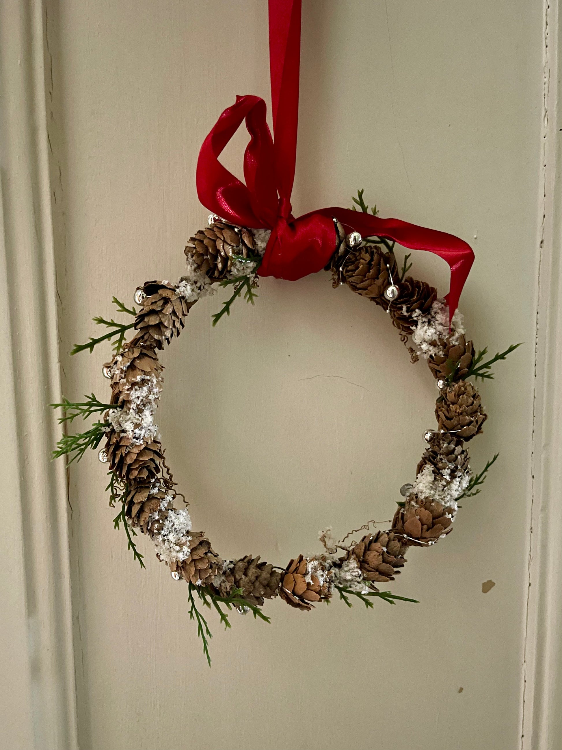 Adicione este detalhe elegante à sua casa. Adquira a sua Coroa Rústica de Pinhas e Pérolas hoje!