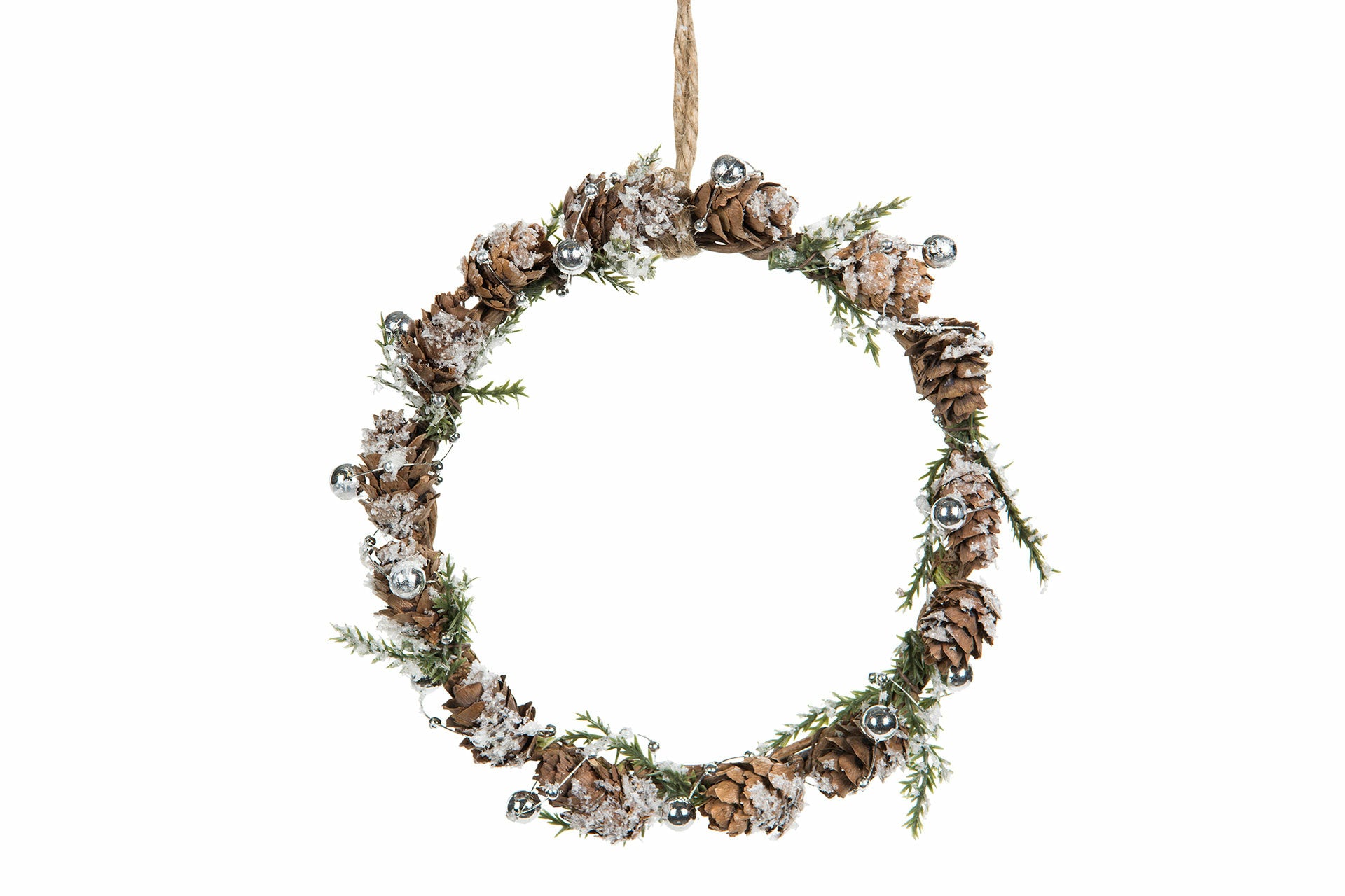 O design é enriquecido com um delicado efeito frosting (geada) e adornado com pérolas metálicas prateadas, criando um contraste sofisticado entre o rústico das pinhas e o brilho festivo. É a união ideal entre o campo e o glamour natalício.