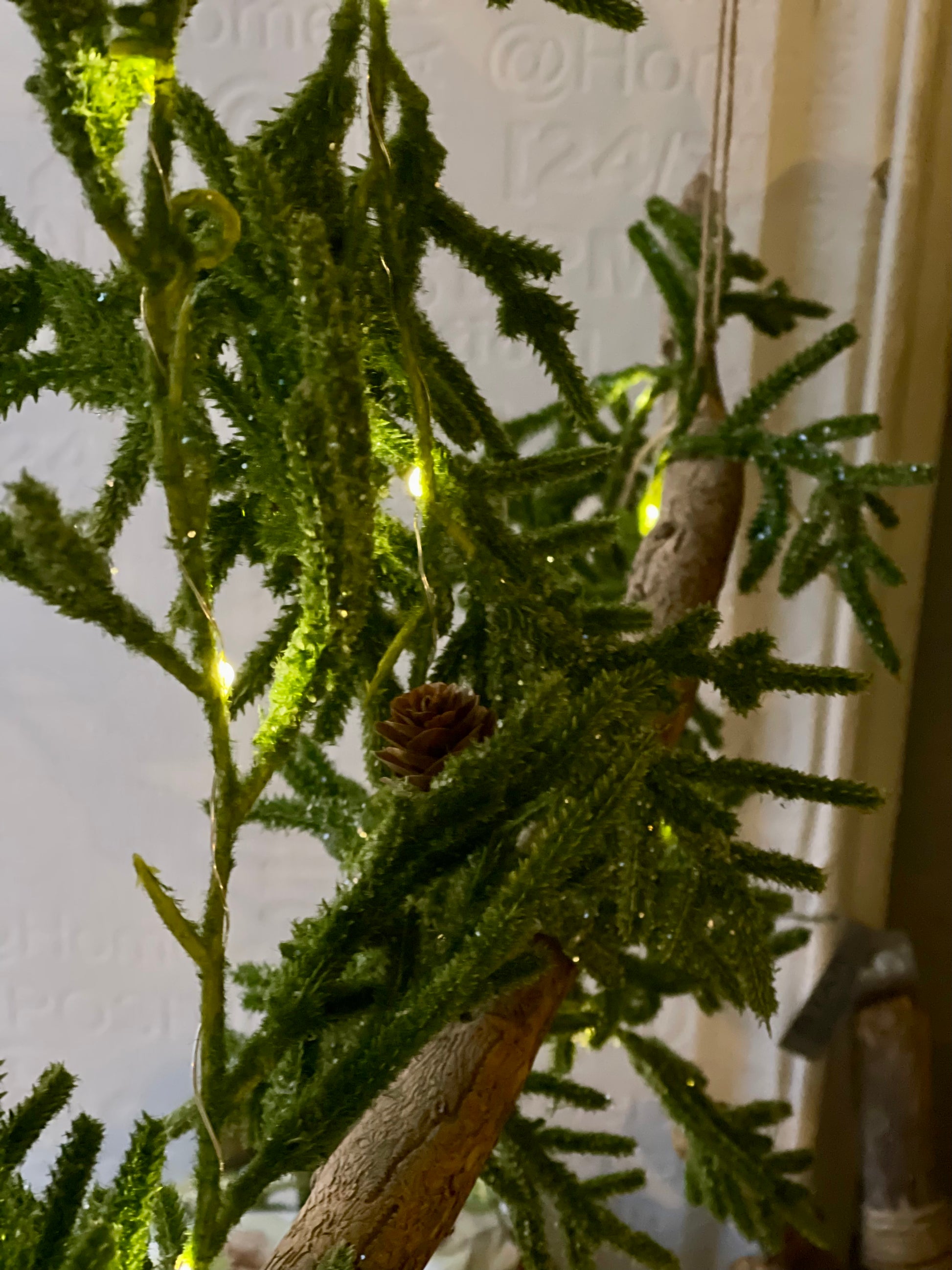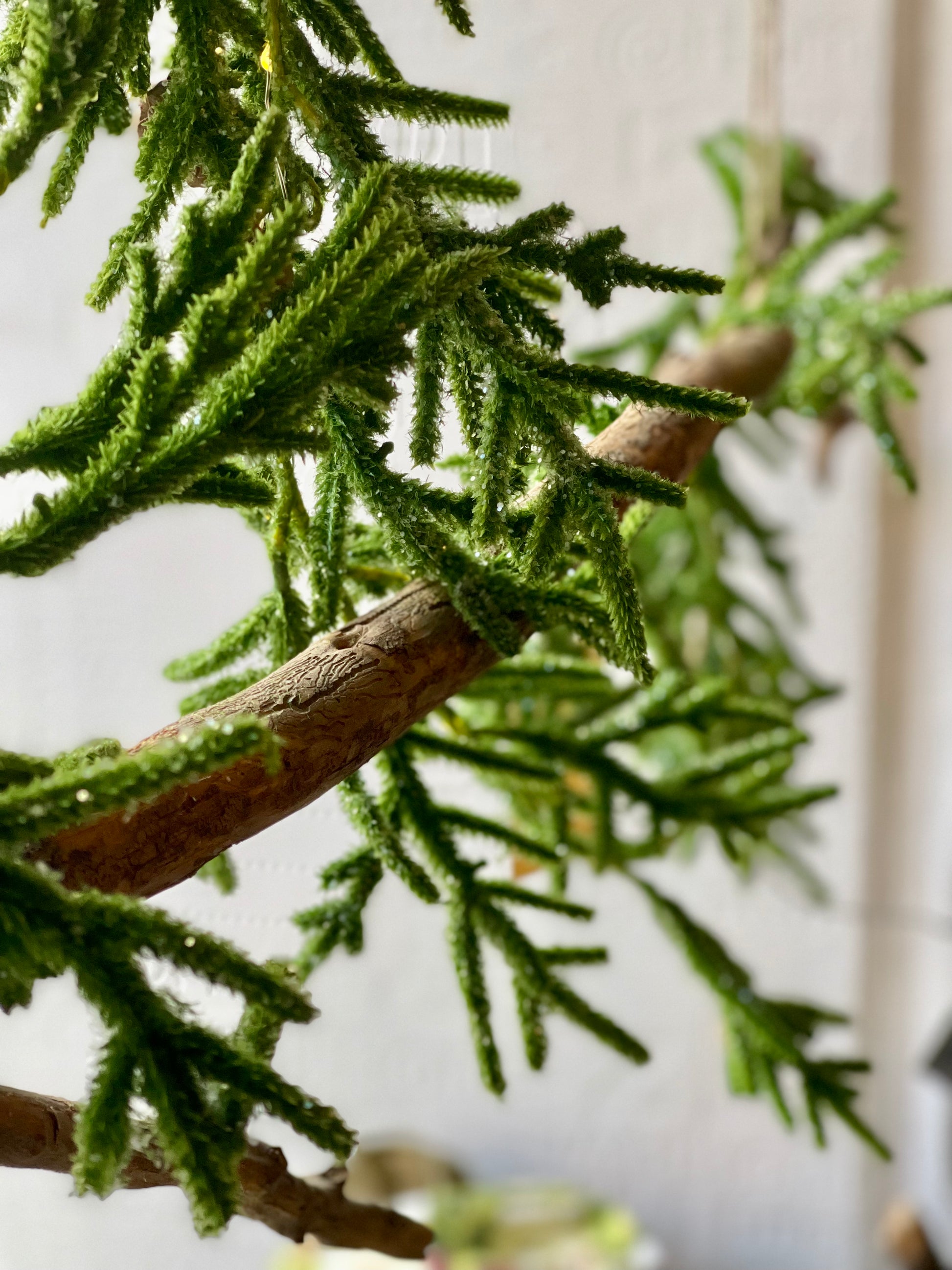 O seu design exclusivo é realçado por folhas e cones decorativos não naturais que replicam a textura e a cor do musgo-de-lobo (Old Man's Beard), conferindo um charme rústico e etéreo.