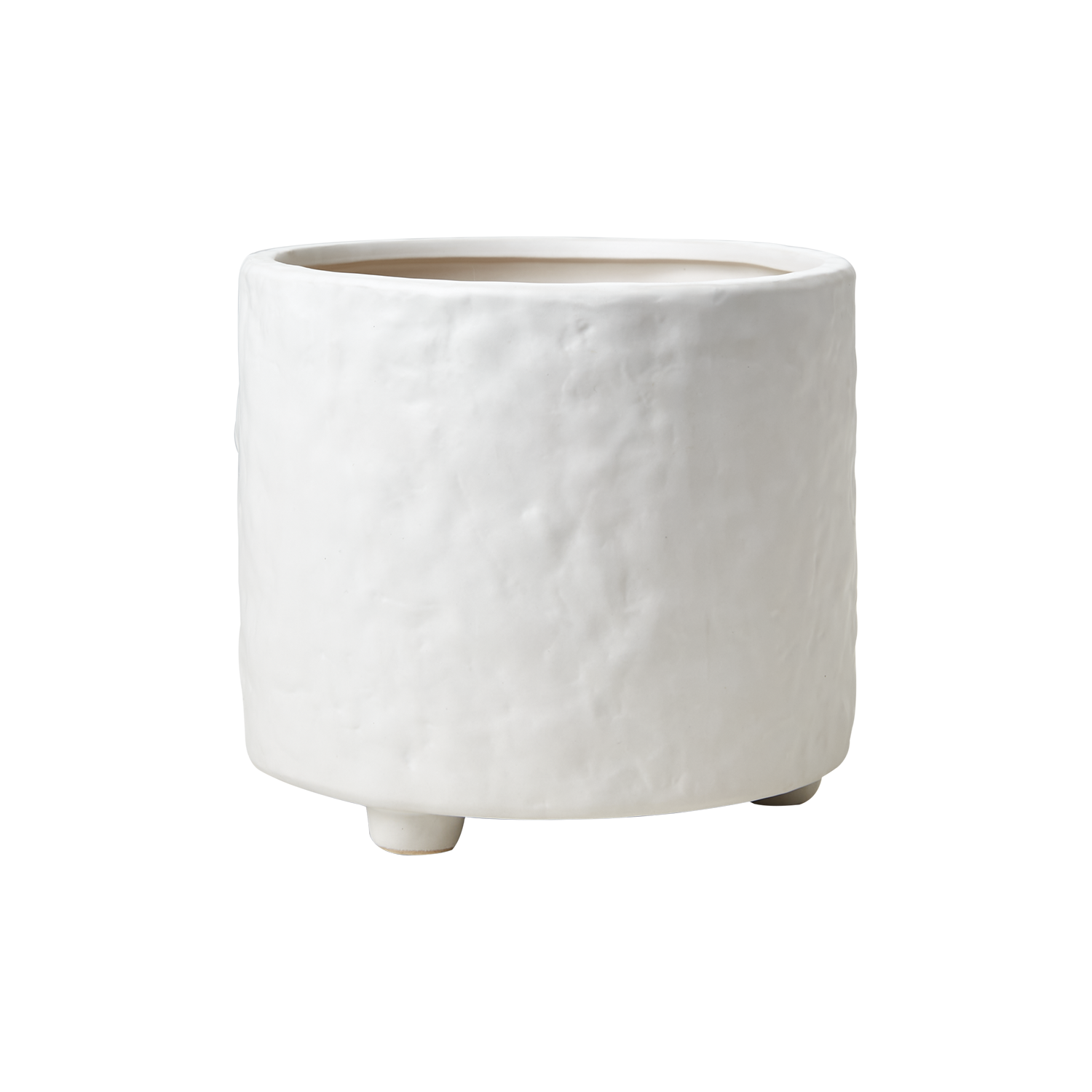 A superfície irregular e levemente rústica remete ao trabalho manual, com textura suave ao toque e variações sutis na tonalidade esbranquiçada que tornam cada vaso único. O acabamento fosco, quase cru, valoriza o aspeto natural da cerâmica e se harmoniza facilmente com estilos de decoração contemporânea, escandinava, boho e minimalista.